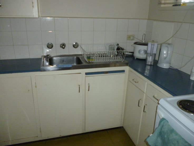 The unit has a 70's style kitchen with electric stove and loads of storage.