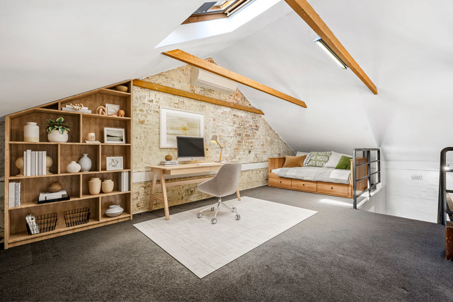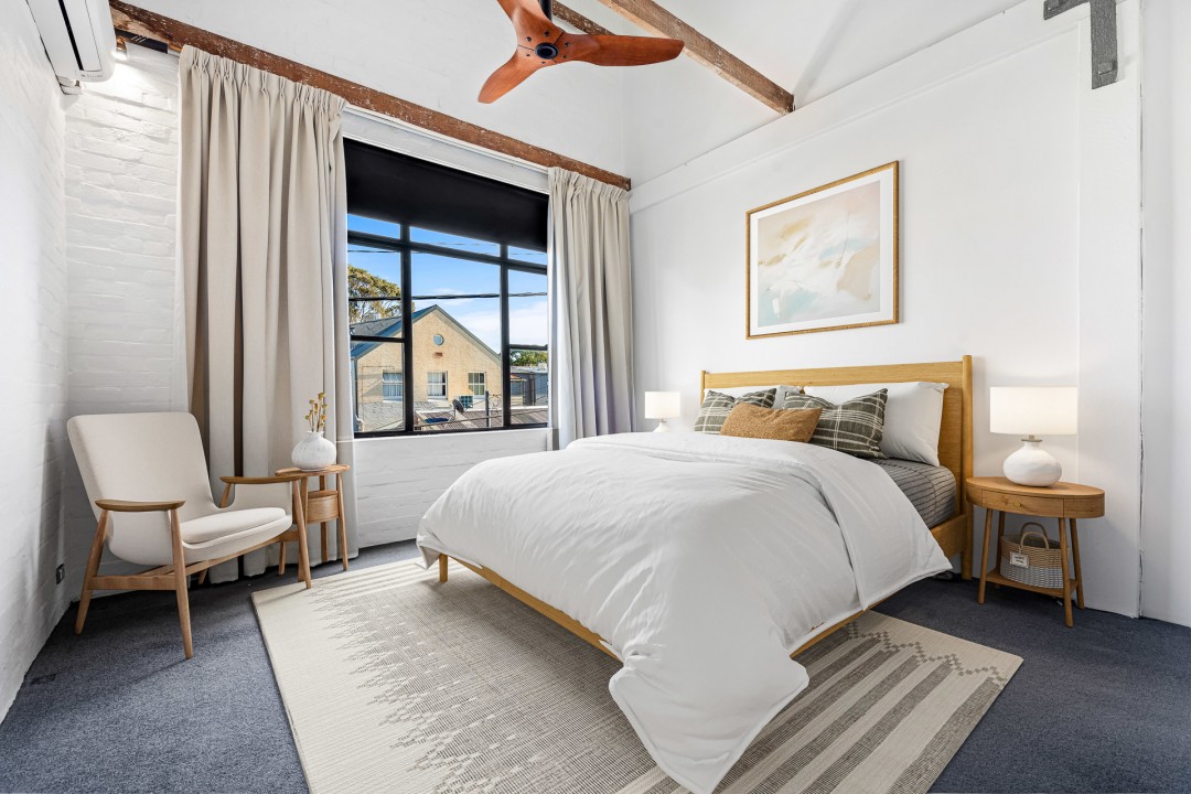 Bathed in natural light, the interiors feature soaring factory-style ceilings, original timber beams, and sleek steel elements, creating a warm yet edgy aesthetic. The generous layout includes a substantial loft retreat and wraps around the building's northern side, sharing only one small common wall - offering exceptional privacy with unbeatable convenience.