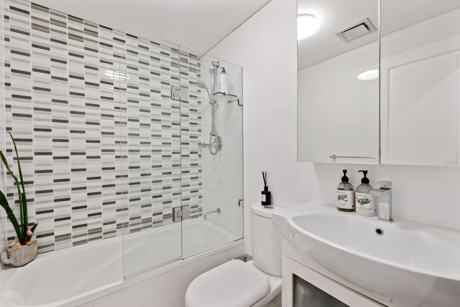 - Neat modern bathroom with clean, contemporary finishes & bathtub