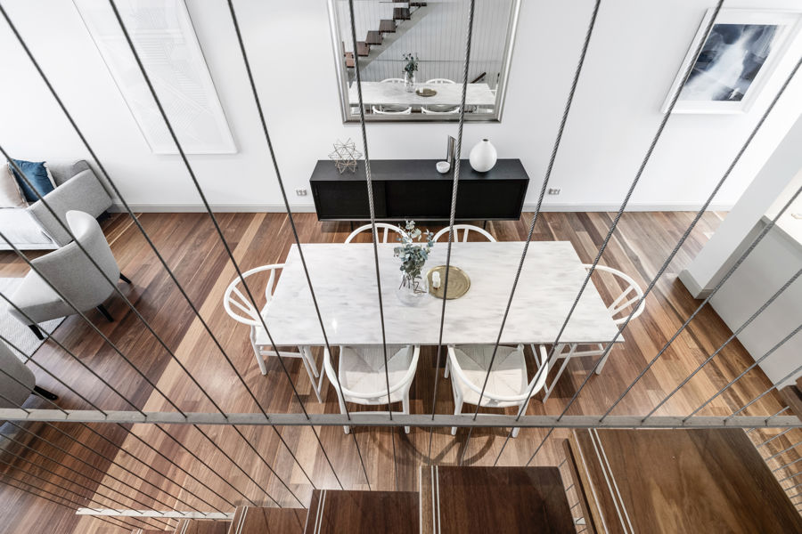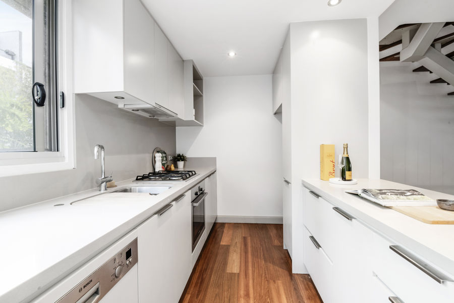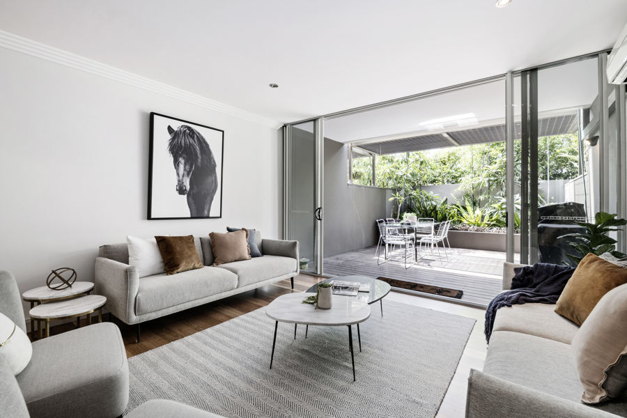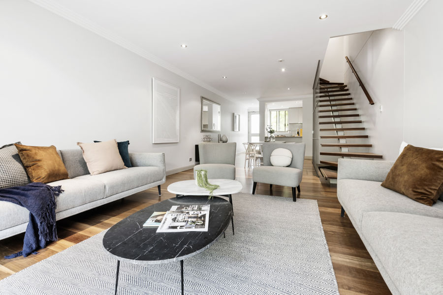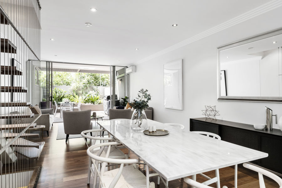 immersion into your own private sanctuary. With high ceilings, a private sun filled courtyard featuring lush green foliage, a crisp, neutral palette and the centrepiece, a floating staircase with stunning timber treads and floor to ceiling balustrading, this indoor/outdoor living space represents the epitome of artful design and craftmanship.