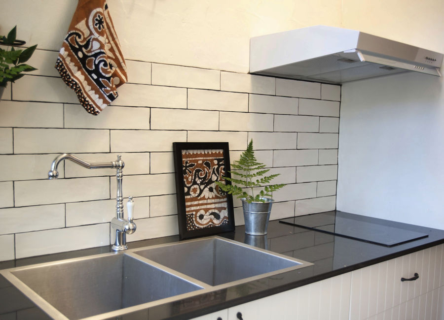 - Black stone benches and sleek cooktop in kitchen