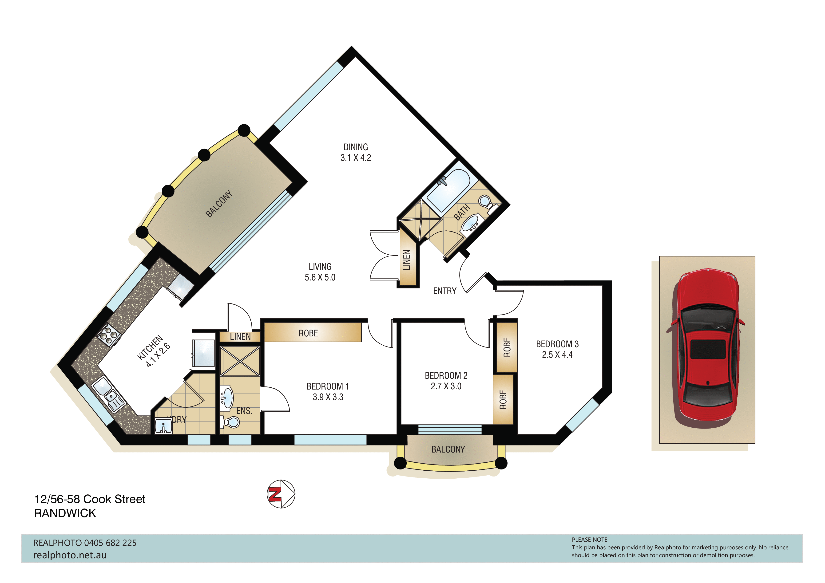 * 107sqm internal and balconies + 24 sqm parking and storage = 131 sqm approx